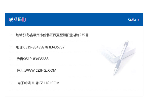 傳真:0519-83435688    郵編:213135    網(wǎng)址:WWW.czjhgj_com.odiebag.com    電子郵箱:JH@czjhgj_com.odiebag.com